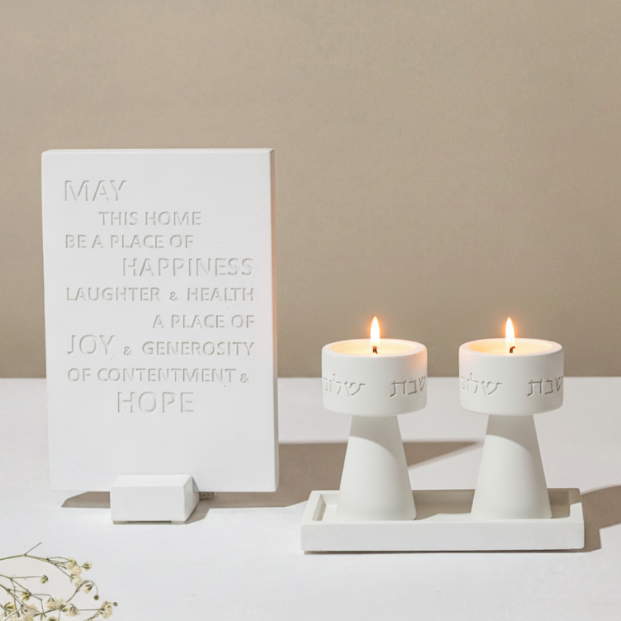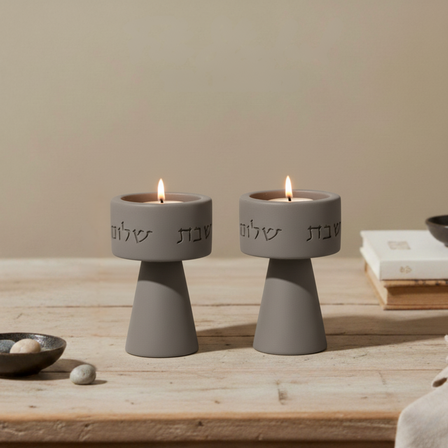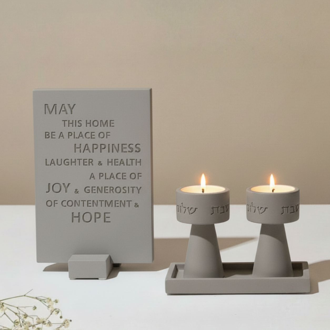 Handmade Concrete Shabbat Candle Set with Tray & Home Blessing – Timeless Glow Series ✨