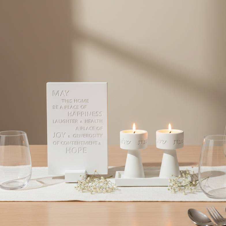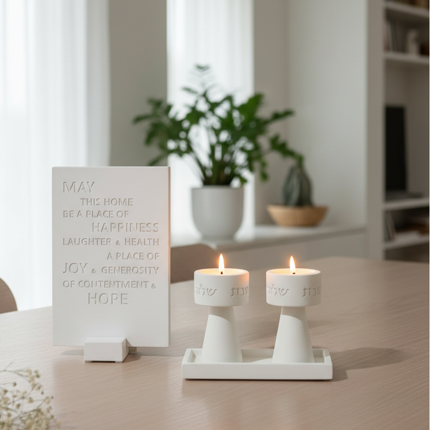 Elevate your Friday night ritual with the Timeless Glow collection. A perfect fusion of traditional significance and modern industrial design, this handcrafted set brings a clean, contemporary aesthetic to your Shabbat table.
