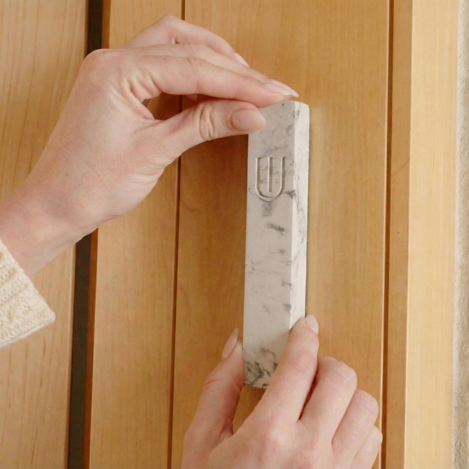 • Press the mezuzah into place with gentle, even pressure to ensure a secure hold
