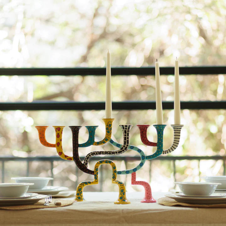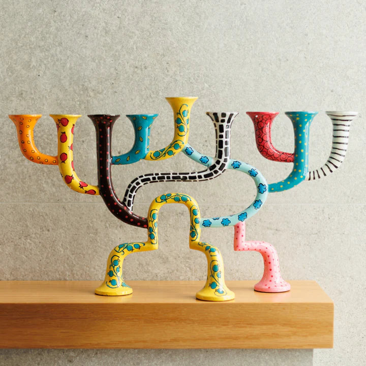 Introducing the Loopa Menorah, a striking, hand-painted menorah from the exclusive SURI collection. With its sculptural design, flowing curves, and vibrant enamel finish, this Hanukkah menorah brings a bold and artistic touch to your Hanukkah decorations.