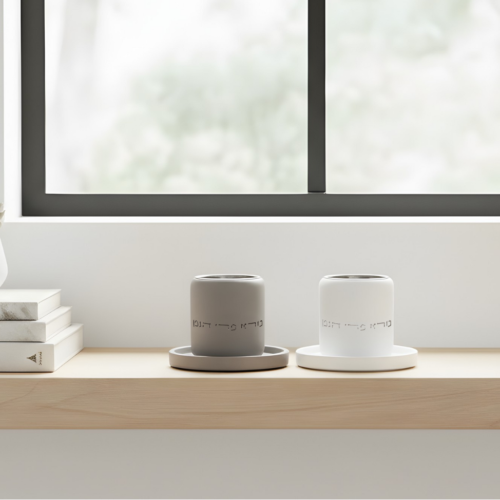Carefully designed with clean lines and a smooth, elegant finish, this concrete Kiddush cup brings a contemporary aesthetic to a sacred ritual. Each piece is handcrafted, offering a sense of authenticity, durability, and understated luxury that will accompany your table for years to come.