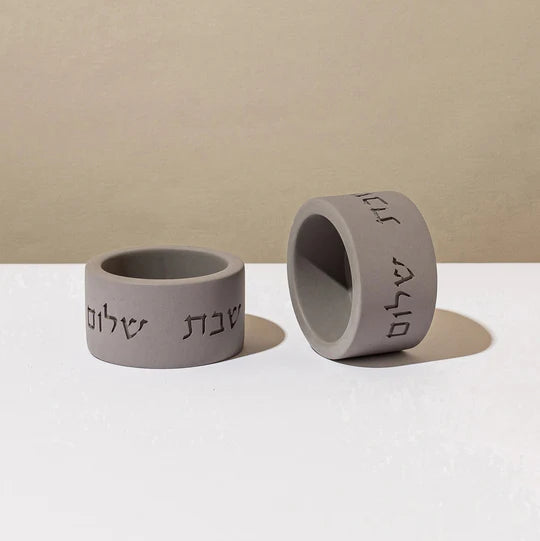 A pair of minimalist Shabbat candle holders crafted from natural concrete, featuring a sleek, smooth finish.