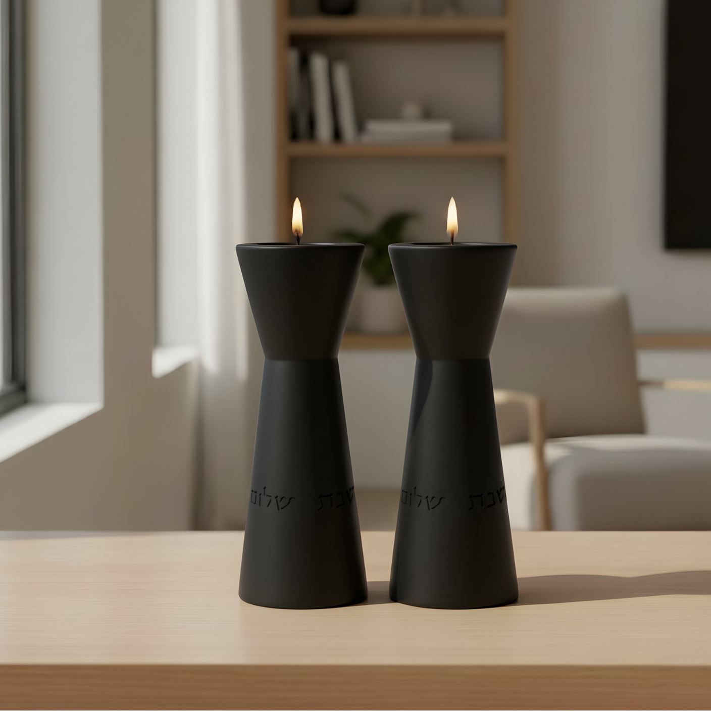 Each candle holder is engraved with “Shabbat” on one side and “Shalom” on the other — a subtle, thoughtful detail that beautifully blends tradition with modern simplicity.