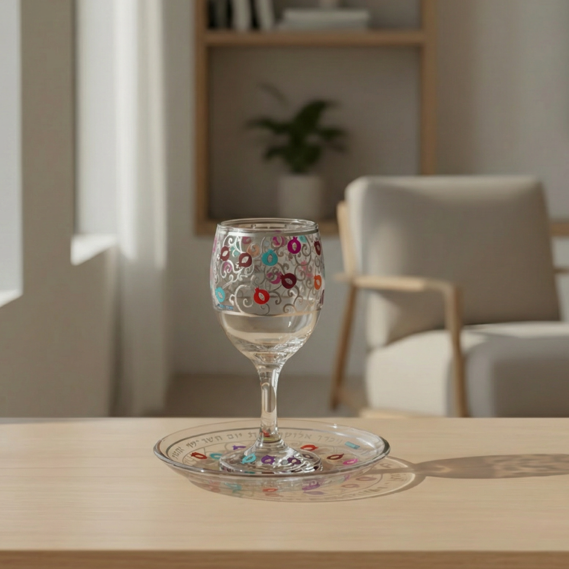 Handmade from high-quality glass and adorned with refined silver etching and rich colors, this Kiddush cup blends classic Judaica with a contemporary, luxurious aesthetic.