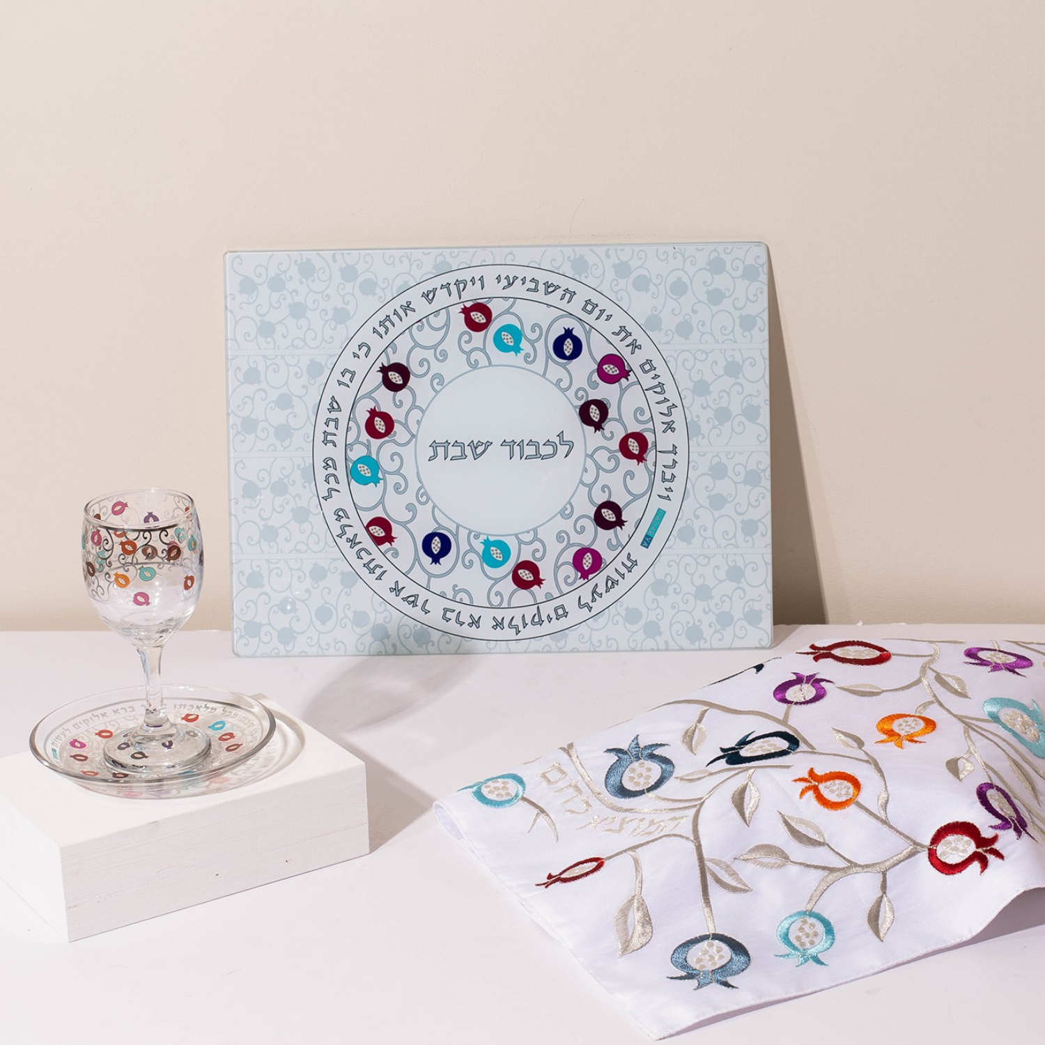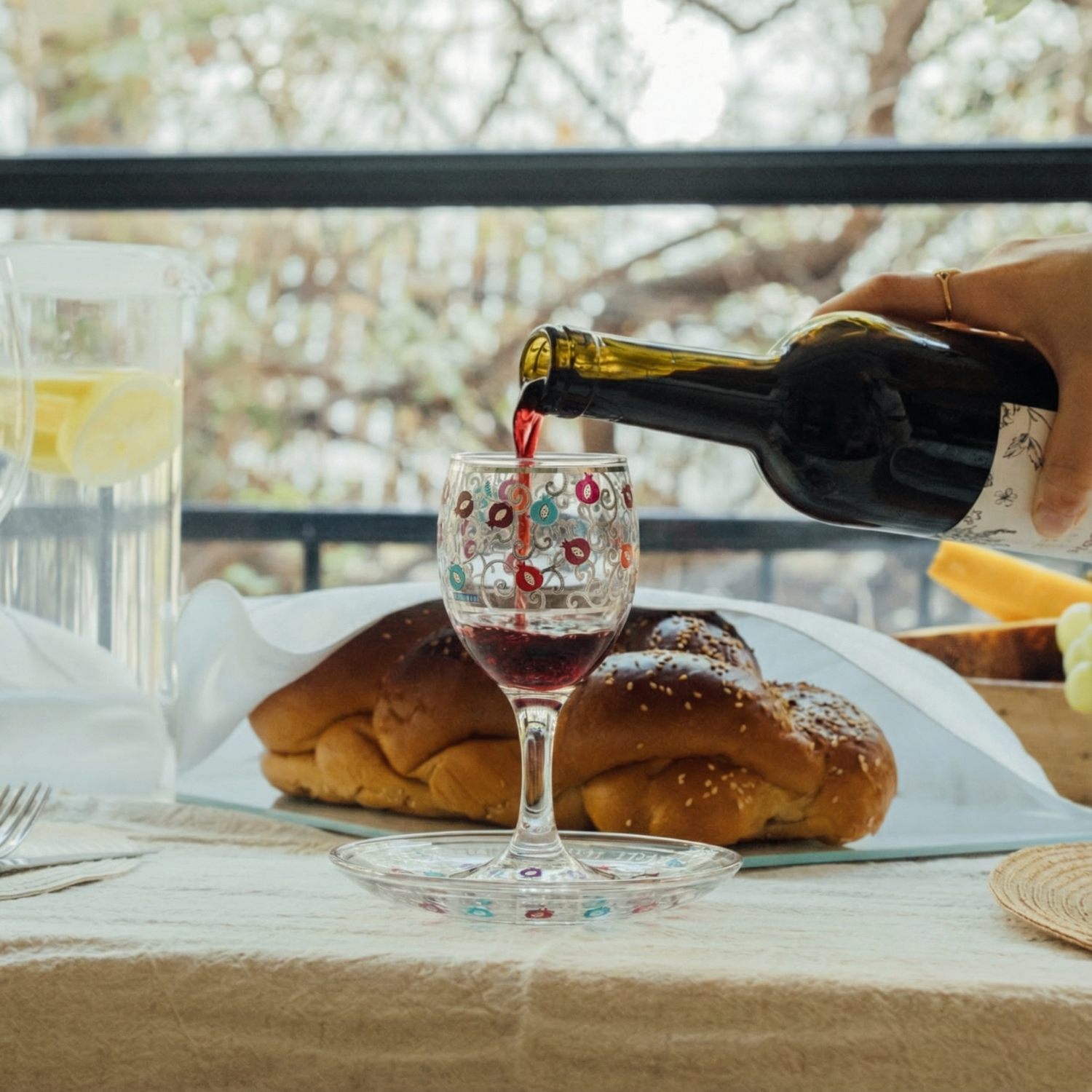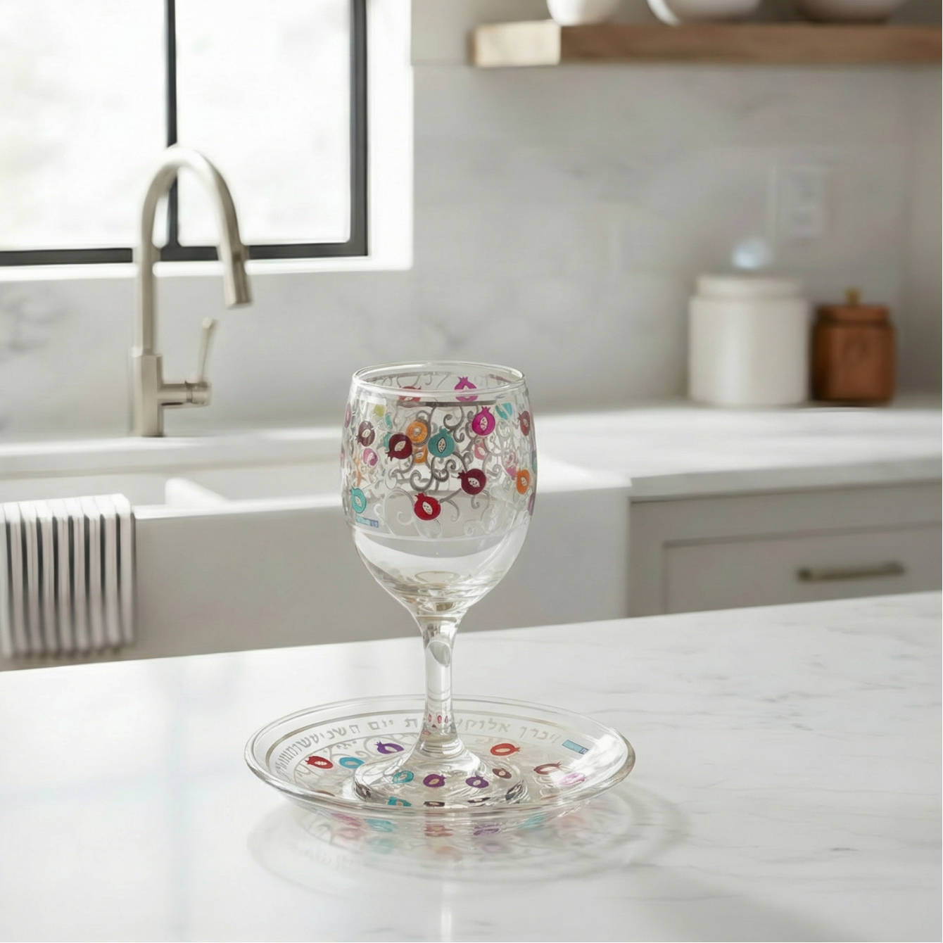 Elevate your Shabbat and holiday table with a beautifully crafted glass Kiddush cup, featuring an elegant pomegranate-inspired design — a timeless symbol of blessing, abundance, and Jewish tradition.