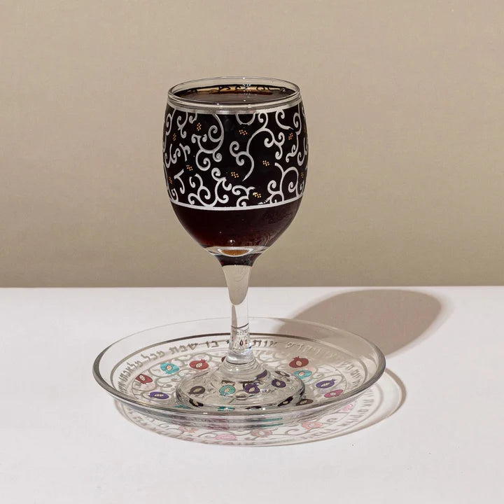 Each cup comes with a matching glass base, creating a harmonious and complete set that adds balance, elegance, and presence to every Kiddush moment.