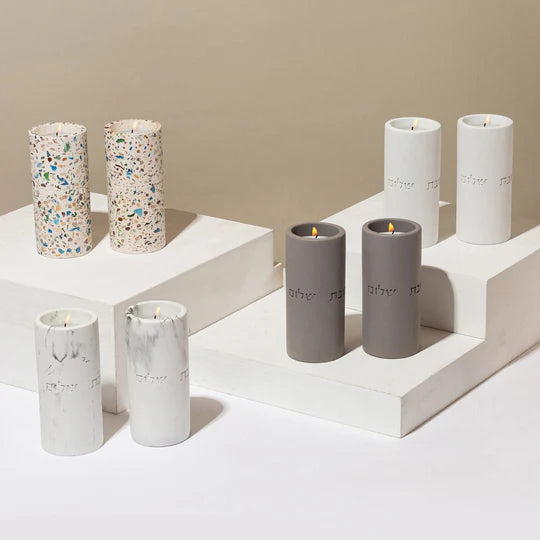 A pair of minimalist Shabbat candle holders crafted from natural concrete, featuring a sleek, smooth finish.