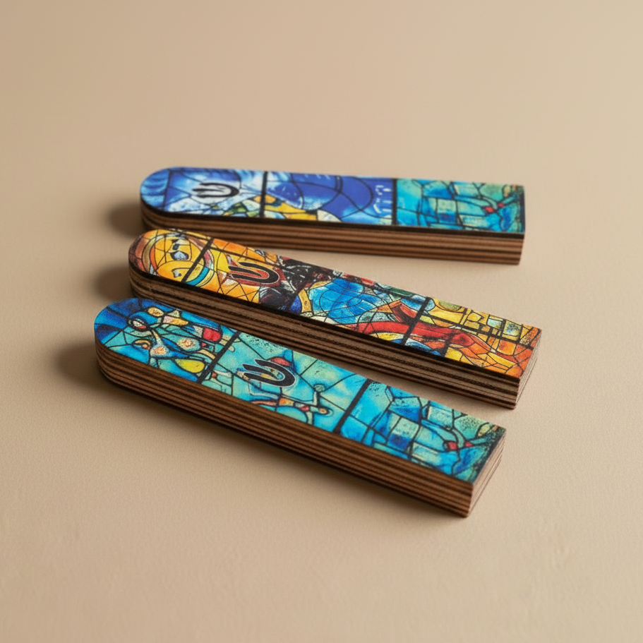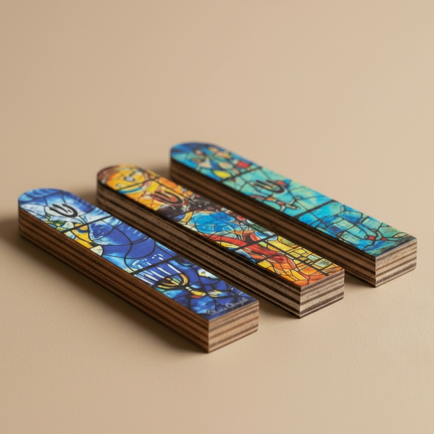 A mezuzah made from natural wood, inspired by the vibrant art of Marc Chagall.